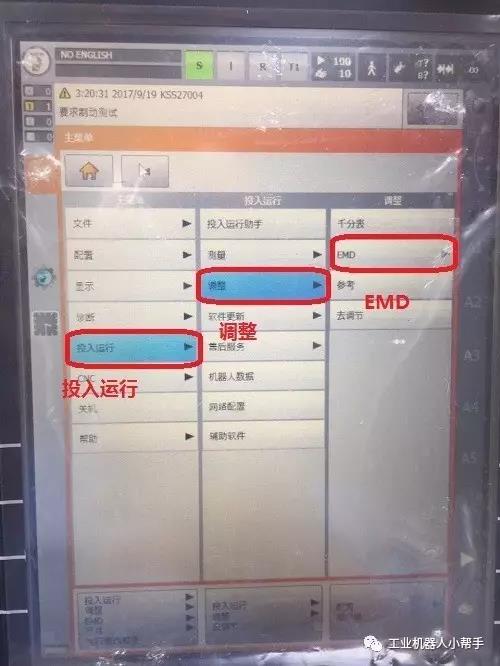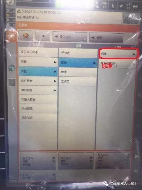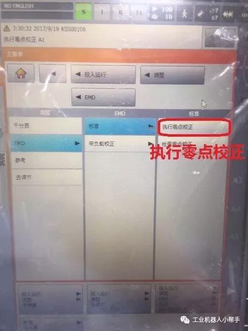 step 4:點擊示教器主菜單鍵,選擇投入運行-調(diào)整-EMD-標準-執(zhí)行零點標定;