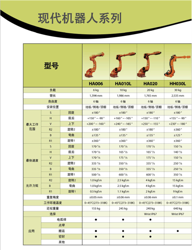 直角坐標(biāo)型工業(yè)機(jī)器人 、 圓柱坐標(biāo)型工業(yè)機(jī)器人、 圓柱坐標(biāo)型工業(yè)機(jī)器人 、多關(guān)節(jié)型工業(yè)機(jī)器人、平面關(guān)節(jié)型工業(yè)機(jī)器人?;『笝C(jī)器人、 激光焊機(jī)器人、電阻焊機(jī)器人、自動(dòng)化焊接機(jī)器人、點(diǎn)焊機(jī)器人、等離子切割機(jī)器人、清潔機(jī)器人、上料機(jī)器人、物料輸送機(jī)器人、材料去除機(jī)器人、包裝機(jī)器人、噴漆機(jī)器人、自動(dòng)鉆孔機(jī)器人、堆跺機(jī)器人、涂層機(jī)器人、去毛刺機(jī)器人、磨銷機(jī)器人、高溫噴涂機(jī)器人等。