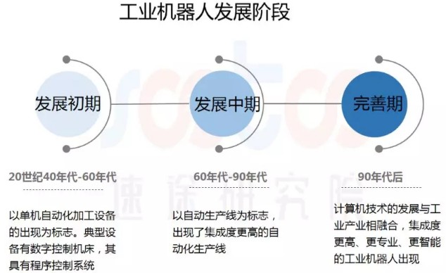 20世紀40年代到60年代是工業(yè)機器人發(fā)展的初期,以單機自動化加工設(shè)備的出現(xiàn)為標志,典型的設(shè)備為1952年麻省理工研制的數(shù)字控制機床,其具有程序控制系統(tǒng)。相比于傳統(tǒng)手工業(yè),自動化加工設(shè)備的優(yōu)勢更加明顯,更加能適應(yīng)批量化生產(chǎn)的需要,并逐漸取代了人工的位置。