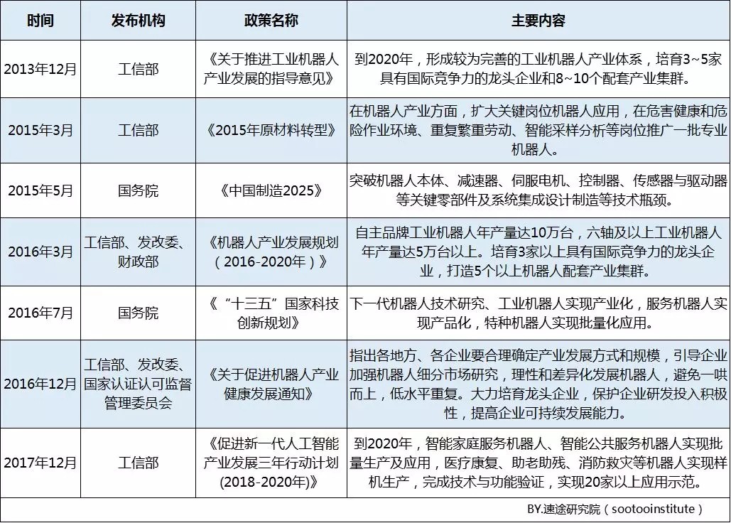 我國工業(yè)機器人市場的快速發(fā)展,離不開國家政策的大力支持。2015年5月,《中國制造2025》文件里提到,要突破機器人本體、減速器、伺服電機、控制器、傳感器和驅(qū)動器等關(guān)鍵零部件及系統(tǒng)集成設(shè)計制造等技術(shù)瓶頸。2016年3月,工信部、發(fā)改委、財政部三部門聯(lián)合印發(fā)《機器人產(chǎn)業(yè)發(fā)展規(guī)劃(2016-2020)》,文件提到自主品牌工業(yè)機器人要年產(chǎn)10萬臺以上,六軸及以上工業(yè)機器人年產(chǎn)量達5萬臺以上,并打造5個以上機器人產(chǎn)業(yè)集群。